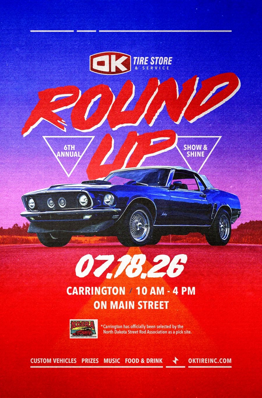 Same simple idea behind every OK Tire Round Up: bring the car community together for a good day. Free registration. Music on the street. Thousands in prizes for registered vehicles. And a downtown that turns into the best open-air car show in central North Dakota.